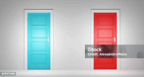 Контрастные решения: синяя стена и красная дверь